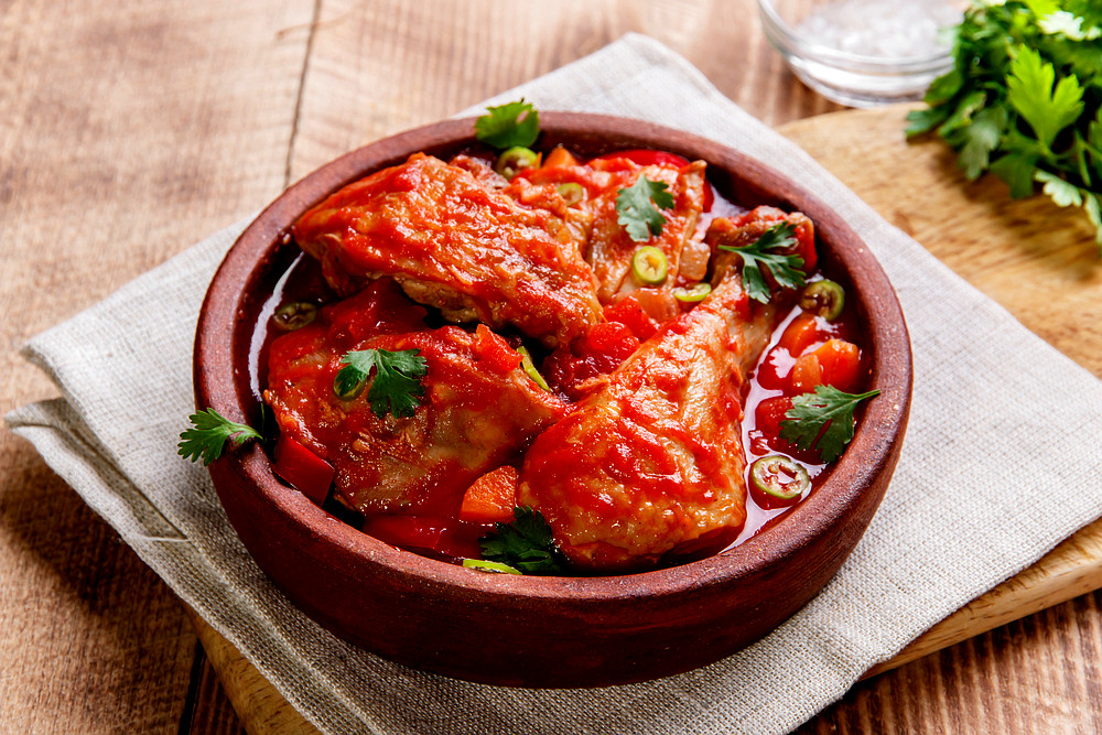 Сам процесс. Курицу разбираем, жир отделяем. Растапливаем его на сковородке (если птичка была стройная, добавляем масла), нарезанный лучок поджариваем до прозрачного состояния. Курицу выкладываем в чугунок, обжариваем, пока не начнется румянец, а вытапливаемый из нее жирок сливаем к луку. Теперь к нему же идут томаты и перемолотые специи – и тушим все это минут 15 на маленьком огне. Теперь пробуем, добавляем чего душа просит (может, соли, может, сахара?) – и тушим в данном соусе курицу, пока она не будет готова. Украшаем блюдо кинзой и радуемся громко и бурно – насколько позволяет набитый вкуснятиной рот!