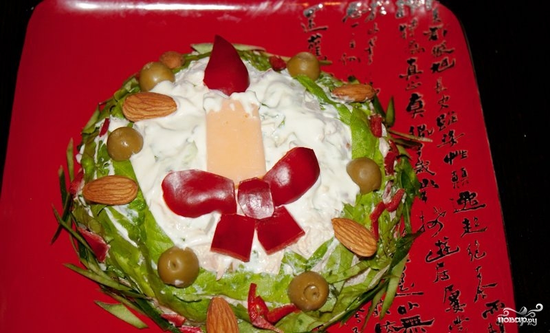 Из красного перца вырезаем кусочки, похожие на пламя свечи, а также кусочки, из которых можно сформировать красивый бантик. При желании можно украсить оливками и орехами. Словом, тут - насколько ваша фантазия позволяет :) Салат готов!