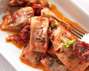 Нагреть масло в кастрюле и обжарить лук (до золотистого цвета), чеснок и тимьян. Добавить вино и уксус, готовить до сокращения объёма вдвое. Добавить измельченные помидоры, мед и воду. Готовить до нужной консистенции. Добавить в соус сок лимона, лимонную цедру и базилик. Приправить солью, перцем. Охладить соус и залить им сельдь, предварительно порезанную на кусочки. Дать настояться в холодильнике не менее 10 часов.